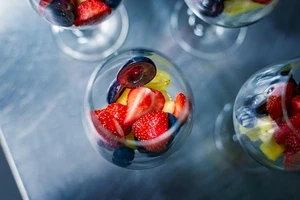 Dados de fruta fresca seleccionada con un toque de menta fresca en shots de vidrio.