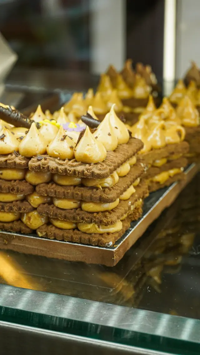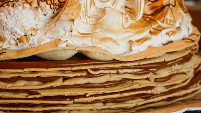 Capas finas de masa crocante con dulce de leche repostero y cobertura de merengue.